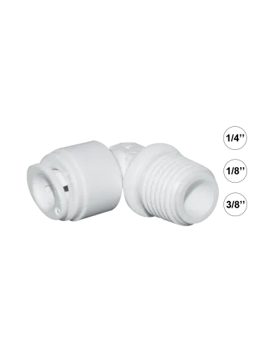 Kolanko przyłączeniowe do systemów filtracyjnych RO i przepływowych umożliwia szybkie i szczelne podłączenia wężyka do gwintu